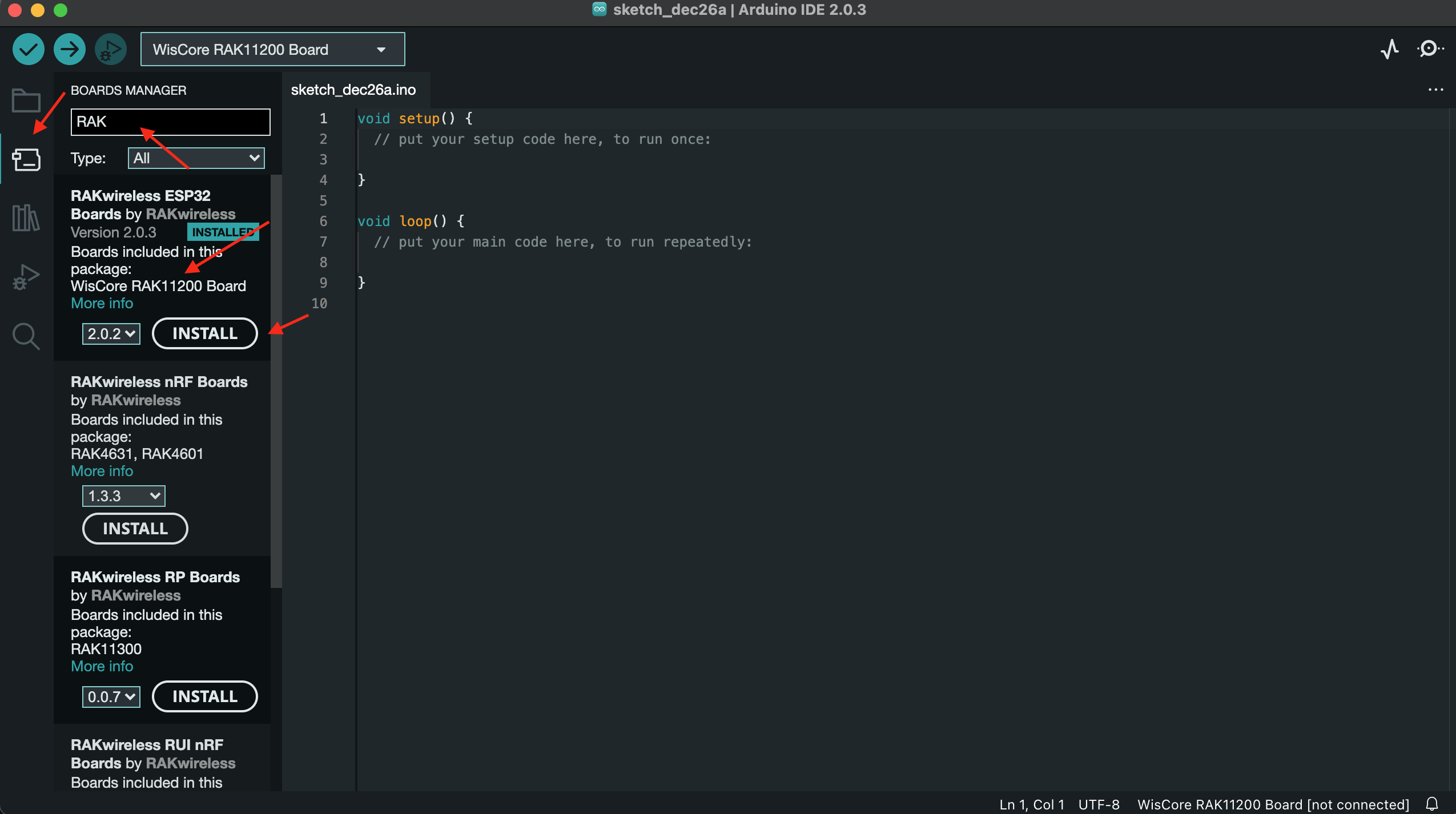 - Open board manager, type RAK and choose the corresponding board.