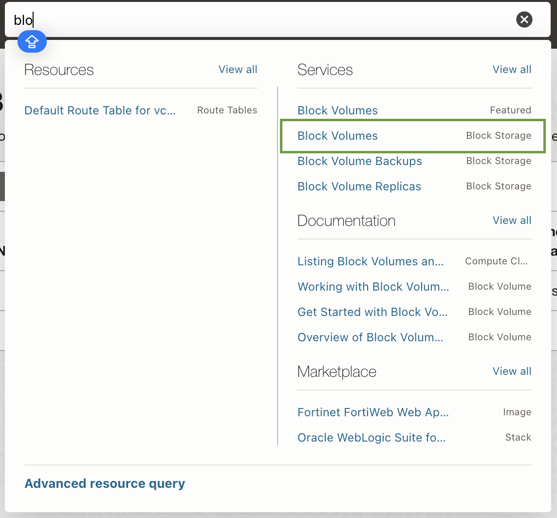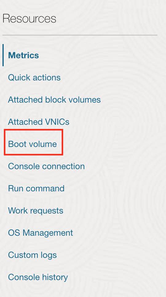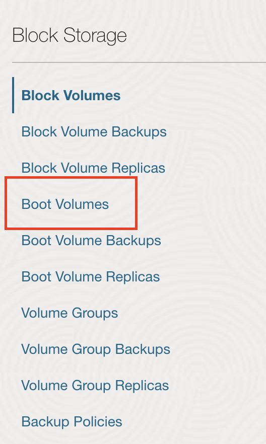 Afterwards, we attach the detached boot volume to the temporary instance. Navigate to Block Storage and find Boot Volumes.