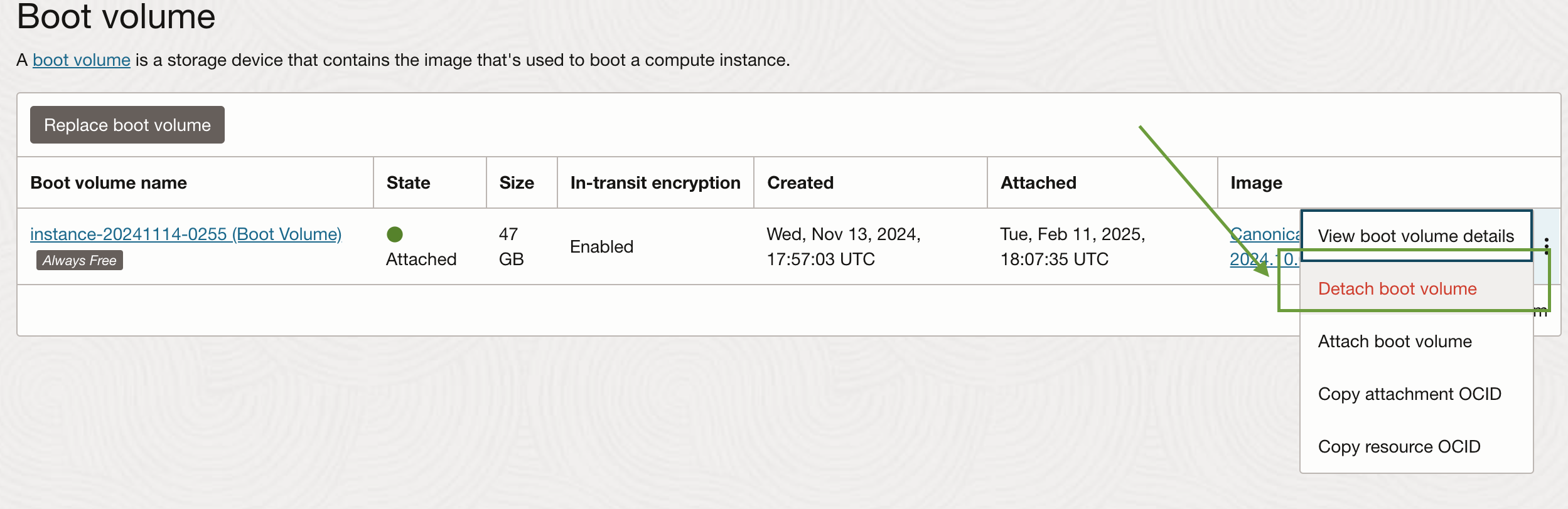 Once it is stopped, we need to detach the boot volume. On the instance details page, scroll down to the Boot Volume section. Find the volume name and click detach the boot volume from the instance.